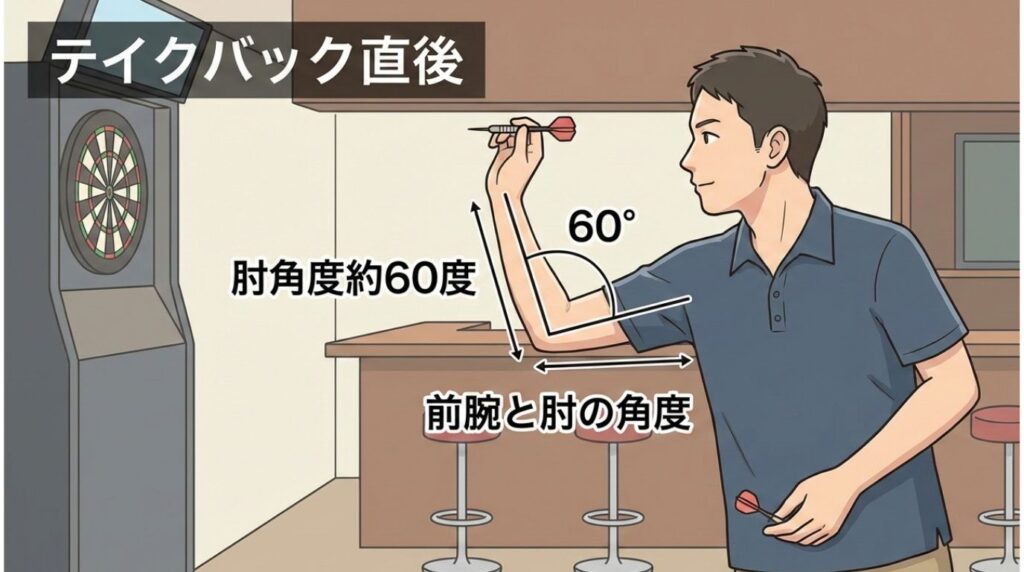 リリース(ダーツを離す)のはあくまでテイクバック(最下点)からすぐの肘が60度程度の位置となります。