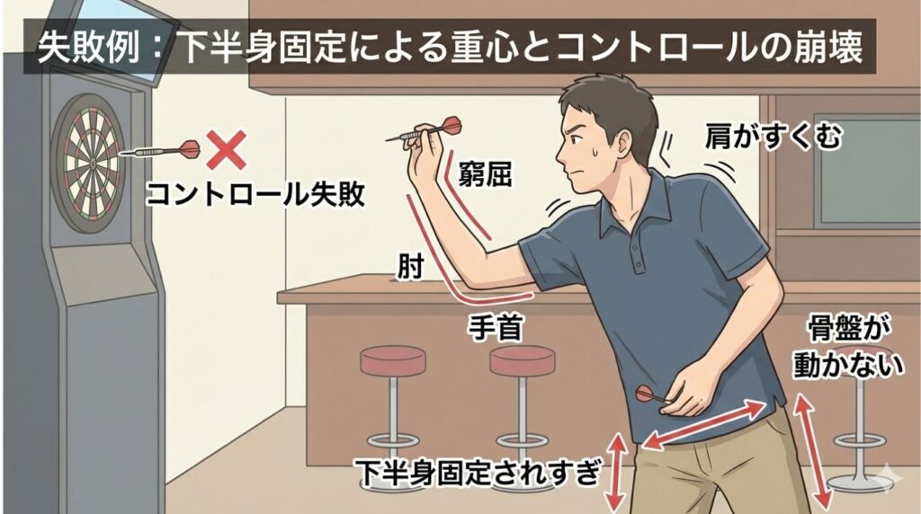 さきほどの下半身固定と同様にダーツに力が伝わらない状態になり、あっていない人に特にとても苦しいフォームとなります。最悪イップスにもなります。