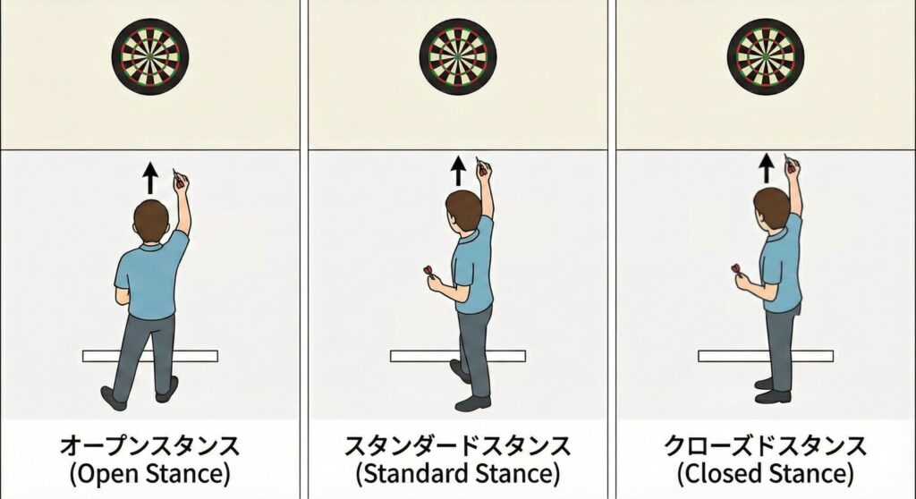 オープンスタンスの軸足でない足(画像の左足)についてはボード正面を向くタイプと斜めに置くタイプがあり、斜めに置くタイプはオープンスタンスの弱点である安定感を補うため、海外のダーツプレイヤーに多いです。