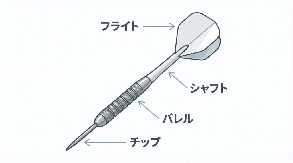ダーツのセッティングはチップ、バレル、シャフト、フライトの四つのパーツで構成されており、それぞれの役割があります。